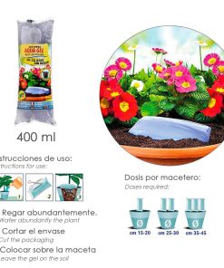– Agua gelificada que también se puede dividir para dar autonomía hídrica a las plantas. Su composición permite una lenta liberación de agua en el suelo que se prolonga de forma constante y gradual. Esto permite dejar la planta desatendida durante un largo período.