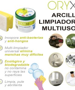 – Uso: Humedecer la esponja / estropajo, y frotar ligeramente la arcilla. A continuación frote la superficie a limpiar hasta que arrastre la suciedad, después aclare con agua y seque con un paño o papel de cocina hasta que quede brillante.