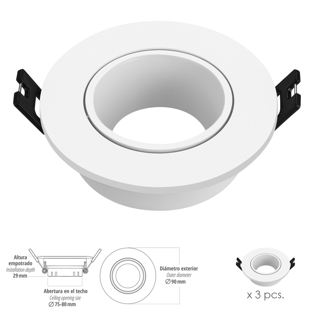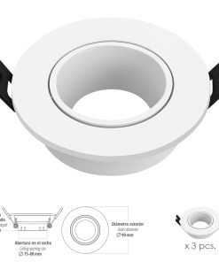 Aro Foco Empotrable Regulable Con Portalamparas Para Bombillas GU10 Ø 90 x 29 mm. Bombilla encastrada. Pack de 3 unidades