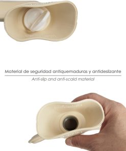 – Sujete la bolsa por el cuello en posición vertical, sobre el lavabo o fregadero y alejada de su cuerpo. Llénela despacio para evitar que el agua caliente le salpique. Elimine el aire de la botella presionándola con cuidado hasta que aparezca el agua por la abertura.
