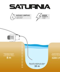 Bomba Aguas Limpias Superficie 800 W. 3.200 lts/hora, Profundidad 8 Mts, Elevación 40 mts. Presion Max: 4,0 Bares