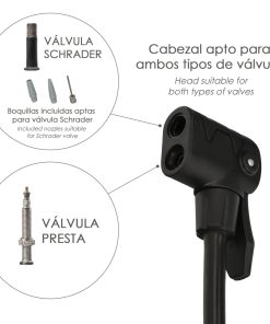 – El cabezal de la bomba está diseñado para poder usar las valvulas Presta y Schrader sin necesidad de adaptadores adicionales, están ambas valvulas en el mismo cabezal.