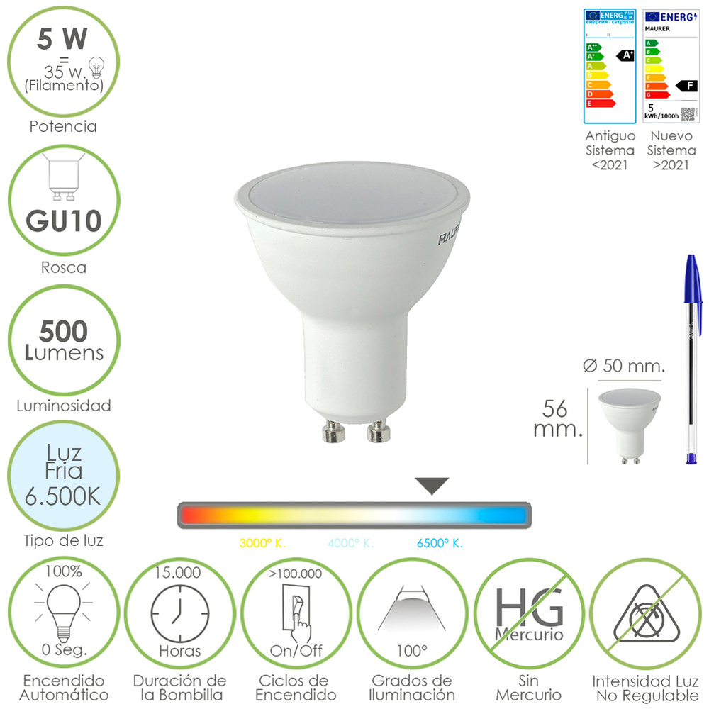 Bombilla Led Dicroica Rosca GU10. 5 Watt. Equivale A 30 Watt. 500 Lumenes. Luz Fria (6500º K.)