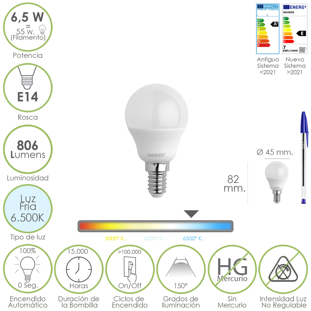 Bombilla Led Esfera Rosca E14. 6.5 Watt. Equivale A 55 Watt. 806 Lumenes. Luz Fría 6500º K.