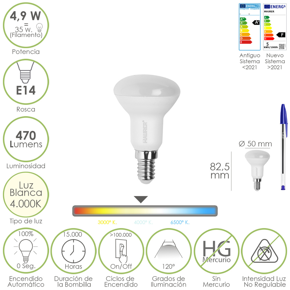 Bombilla Led Reflectante Rosca E14. 4,9 Watt. Equivale A 35 Watt. 470 Lumenes. Luz Neutra (4000º K.)