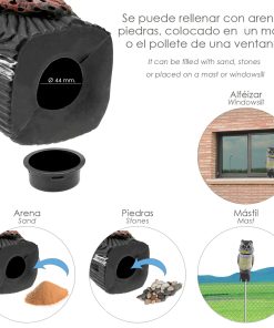 – La base del buho dispone de un orificio (Ø 44 mm.) para ser colocado en un mastil o ser rellenado de arena o piedras.