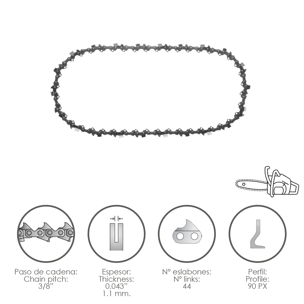 Cadena Motosierra 3/8″ / 0.043″ 1,1 mm. / 44 Eslabones / 90 PX