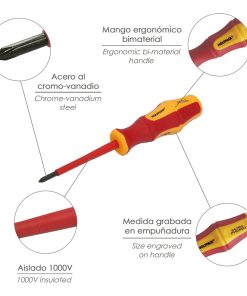 – Articulo conocido como destornillador Phillips, destornillador seguridad Phillips, destornillador electricista, destornillador seguridad electricidad, destornillador electricista.