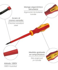 – Articulo conocido como destornillador plano, destornillador seguridad plano, destornillador electricista, destornillador seguridad electricidad, destornillador electricista.