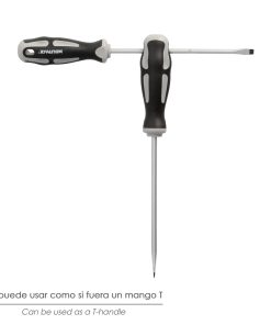 – Mango con acabado plano para poder usar una llave fija o una llave inglesa y aumentar la fuerza de apriete, también se puede como otro si fuera un mago T, introduciendo otro destornillador a través del orificio del mango.