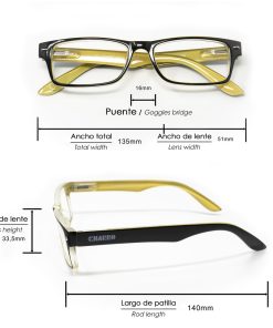 – Gafas de aumento para lectura con montura bicolor negro y amarillo.