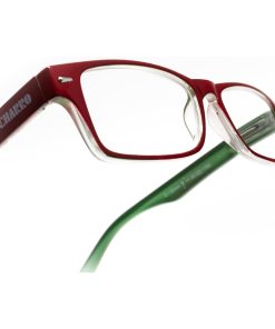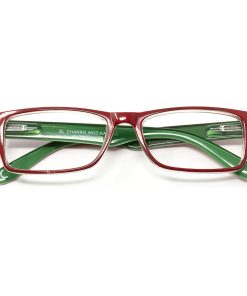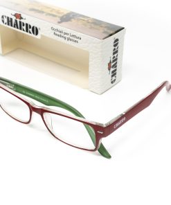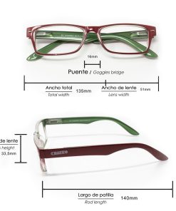 – Gafas de aumento para lectura con montura bicolor rojo y verde.