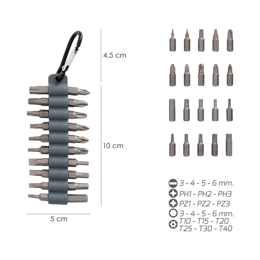 – Incluye mosqueton para ser colgadas en un cinturon o bien tenerlas de forma organizada en su caja de herramientas.