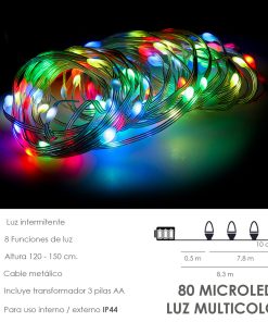 Luces Navidad Luz Multicolor 80 Microled a Pilas Con Mando. Protección IP44. 3 Baterias AA