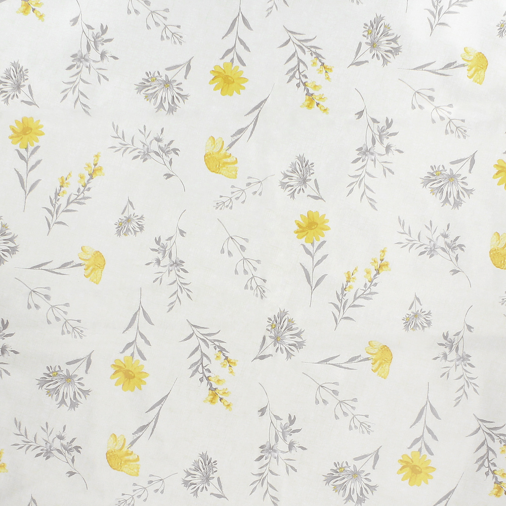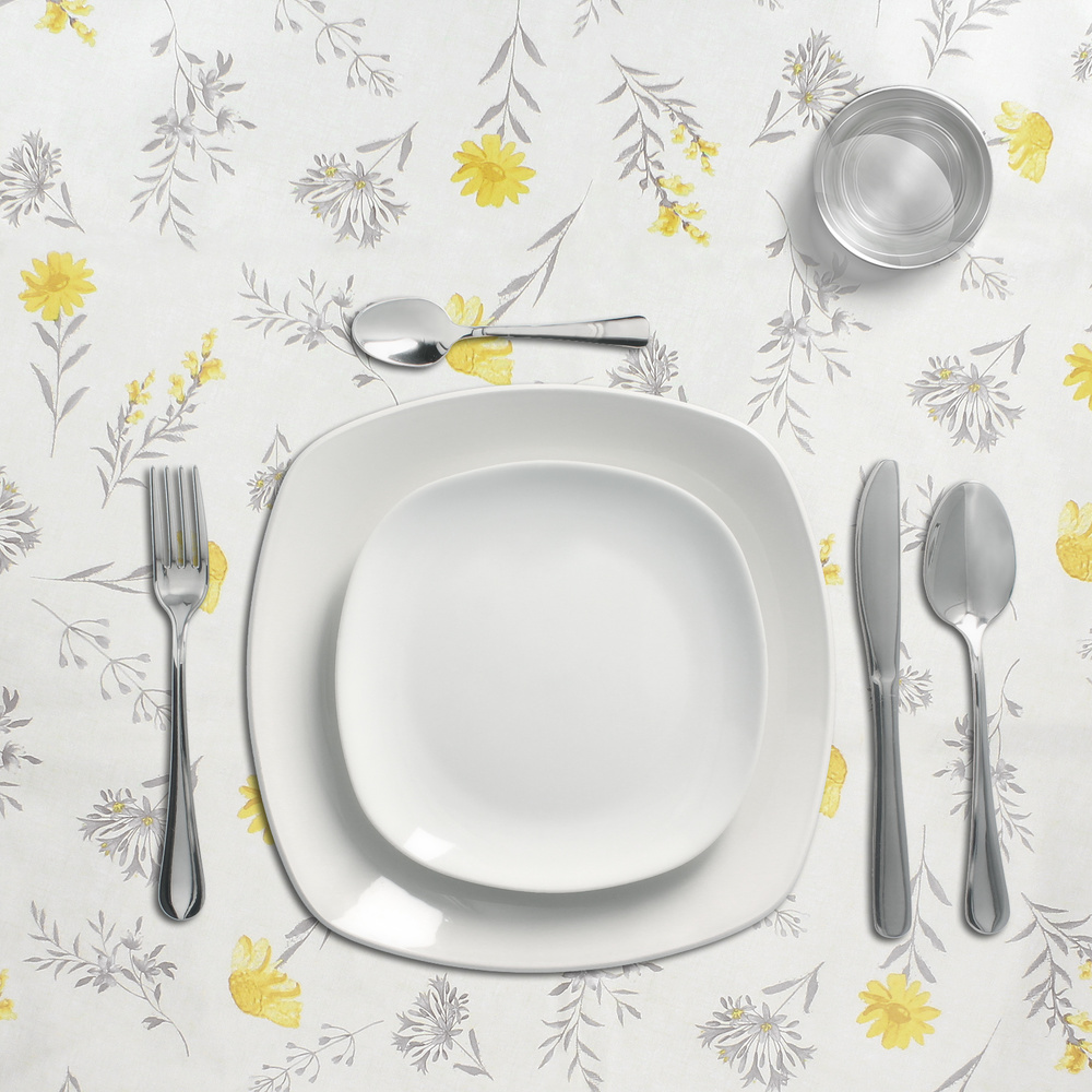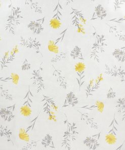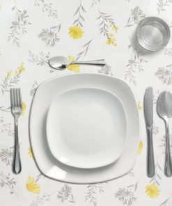 – Mantel Hule estampado en color gris con formas de flores amarillas. Diseño moderno y elegante para cualquier ocasión.