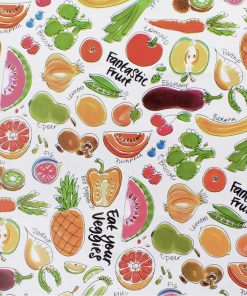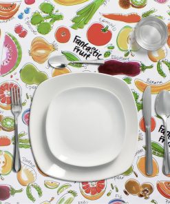 – Mantel Hule estampado en color blanco con formas de frutas divertidas en varios colores. Diseño moderno y elegante para cualquier ocasión.