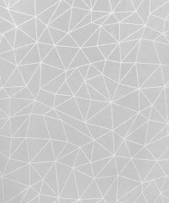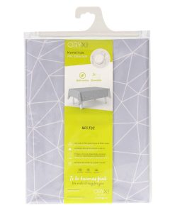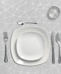 – Mantel Hule estampado en color gris con formas geométricas blancas. Diseño moderno y elegante para cualquier ocasión.
