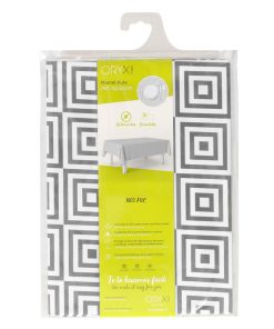 – Mantel Hule estampado en color blanco con formas de rombos grises. Diseño moderno y elegante para cualquier ocasión.