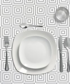 – Mantel Hule estampado en color blanco con formas de rombos grises. Diseño moderno y elegante para cualquier ocasión.