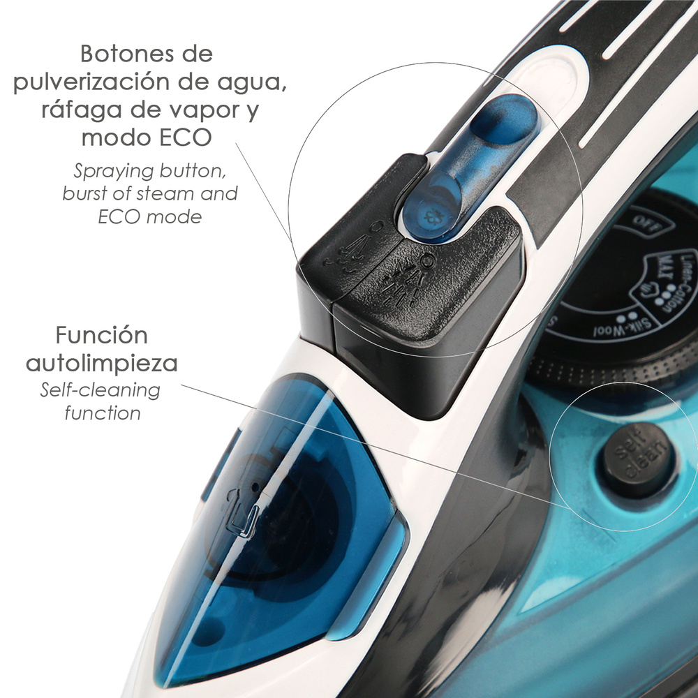 – También cuenta con la función ECO para poder planchar en seco y ayudarte a ahorrar. Para mantener tu plancha en perfecto estado y conseguir alargar su vida útil cuenta con la función de autolimpieza y su sistema antical.