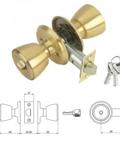 – Cerradura de pomo con picaporte. Pomo libre con llave por el exterior y pomo libre con condena por el interior.