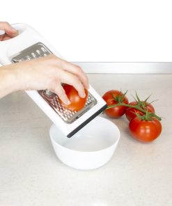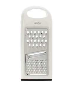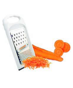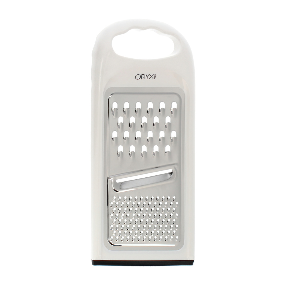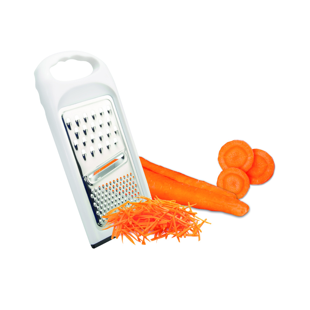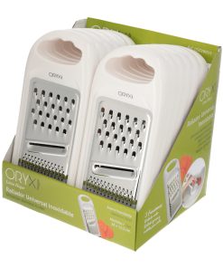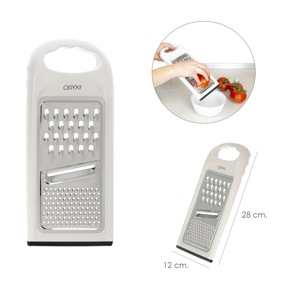 – Rallador de acero inoxidable con cuerpo de plástico blanco ABS y base antideslizante.