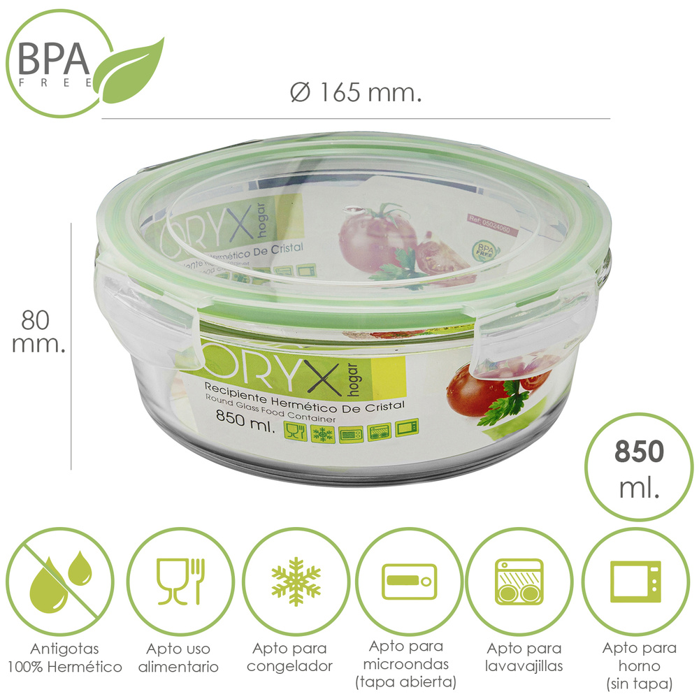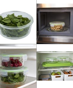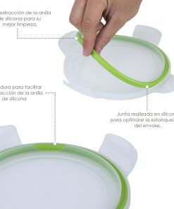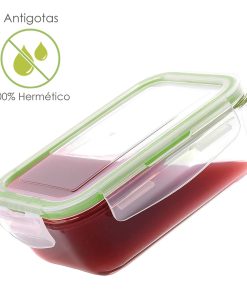 – Recipientes herméticos para una mejor conservación y un transporte sin derrames, no conserva olor ni sabor de alimentos contenidos anteriormente. Las tapas cuentan con un sistema de 4 cierres de bloqueo además están realizadas en silicona inyectada que se adhiere al cristal aislando los alimentos de gérmenes y olores externos y favoreciendo su perfecta conservación.