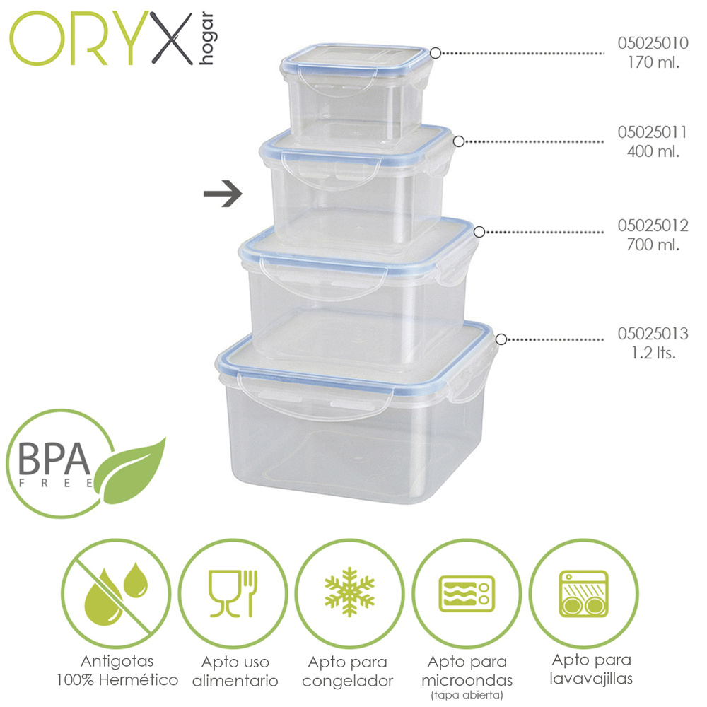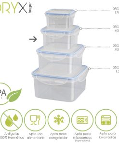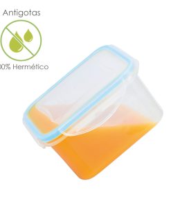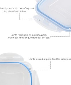 – Recipientes herméticos para una mejor conservación y un transporte sin derrames. Las tapas cuentan con un sistema de 4 cierres de bloqueo además están realizadas en silicona inyectada que se adhiere al recipiente aislando los alimentos de gérmenes y olores externos y favoreciendo su perfecta conservación.