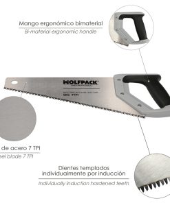 – Dientes del serrucho templados con triple afilado, cuenta con una separación de 7TPI, especialmente diseñado para maderas blandas, contrachapados, suelos, laminados, tuberías de plástico PVC/ABS, etc.