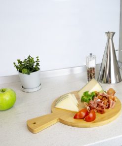 Tabla Cortar Cocina Redonda de Madera de Bambu Con Mango Ø 26 x 36 cm.