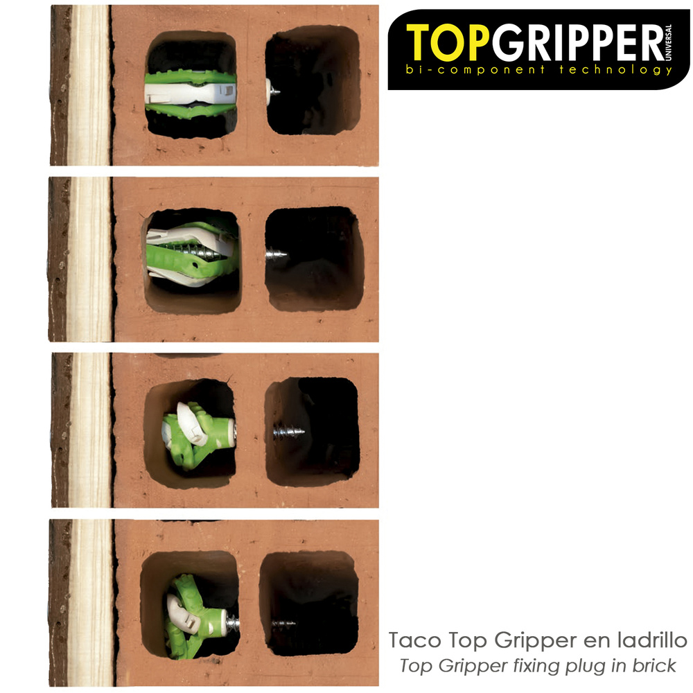 – Taco realizado en Bimaterial multiexpansión apto para todo tipo de material, (Piedra / Hormigón / Ladrillo macizo / Ladrillo Semisólido / Ladrillo hueco / Bloque hueco de hormigón / Placa de yeso / Pladur)