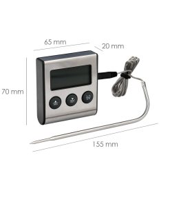 – Este termometro con sonda cableada cuenta con funciones de medición de temperatura ademas de alarma, puede activarse cuando el alimento llegue a la temperatura indicada o podemos programar la alarma por tiempo de cocinado.