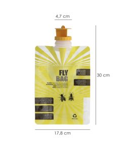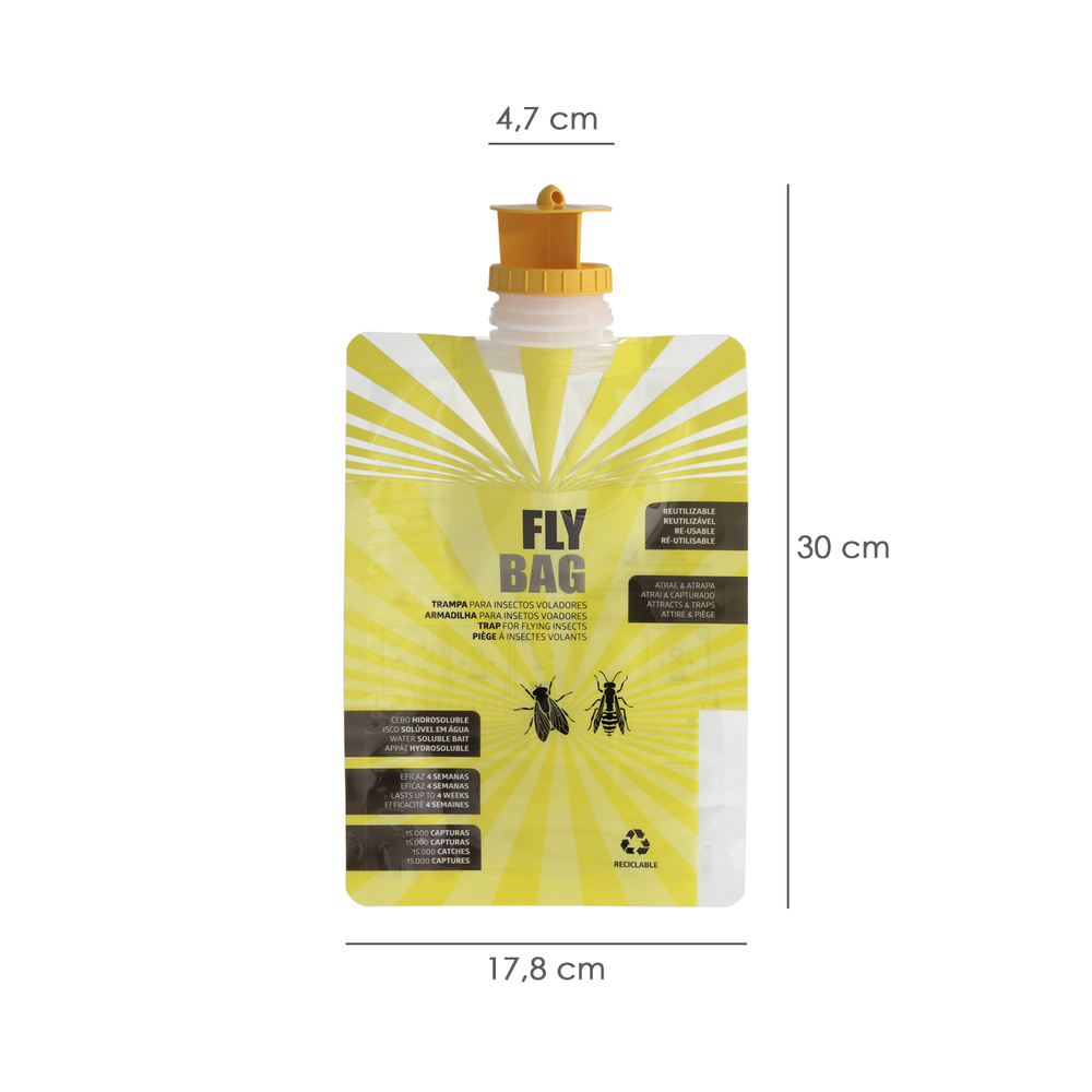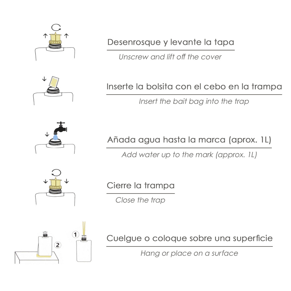 – Sistema fácil para limitar la presencia de moscas en el jardín. Coloque un sobre con el cebo alimentario en la trampa y añada un litro de agua. Enrosque la tapa.